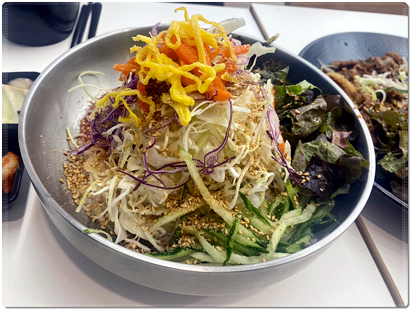 보세요. 양배추채가 아주 가늘어서 먹으면 아삭 소리가 날 정도였어요. 양배추가 몸에 좋잖아요 납작 비빔만두에도 비빔국수에도 야배추 채가 소복이 넣어 셨습니다. 그리고 밥도 일반 백미가 아닌 몸에 좋은 흑미를 주셨어요. 그리고 세심하게 잘 비벼 드시라고 밥을 납작하게 펴주셨습니다. 그래서 비벼먹는데 편했습니다. 아쉽게도 콩국사진은 없습니다. 덜어먹는 접시도 있었습니다. 매장은 좀 작은 편 이지만 자리는 많았습니다. 여름에는 콩국수가 많이 팔렸던 것 같고 겨울에 본격적으로 콩국의 계절이 온 것 같습니다. 대구에 오래 살았거나 대구토박이들은 콩국을 잘 알고 있더라고요. 저는 작년에 칠곡본점이 생기면서 알았습니다. 그래서 명덕역에 콩구집이 두 군데 있었는데 혼자 가서인지 어떻게 먹는지도 모르겠고 맛도 모른 채 먹었었는데 이번에 대한콩국 상인점 가서 맛있게 먹는 법을 알았습니다. 암튼 맛있게 잘 먹었습니다. 운영시간은 새벽 한 시 까지 하신다고 하셨습니다. 오전 10시부터 새벽 1시까지 영업합니다.