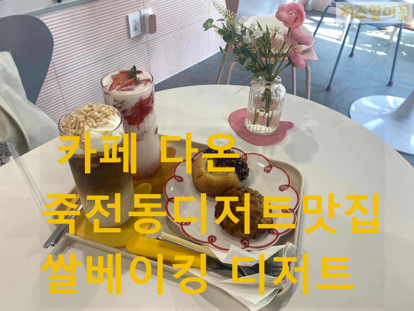 생딸기요구르트는 딸기청과 생딸기가 들어가 있고 라이스 라테는 커피인데 라테의 베이스가 쌀로 만든 베이스라고 하더라고요. 그래서 크림 위에 살과자가 올려져 있었어요. 쌀과자를 먼저 티스푼으로 먹고 커피를 먹으면 됩니다.