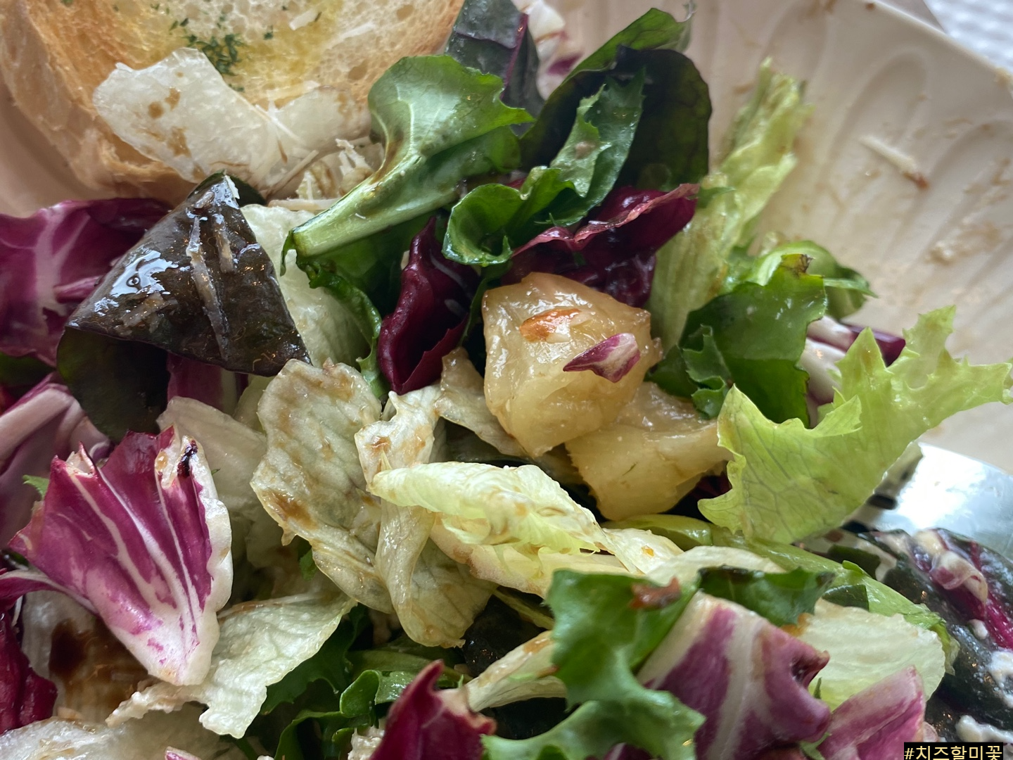 제가 맛있게 먹은 것은 샐러드와 애플파이피자와 자몽에이드를 먹었습니다.