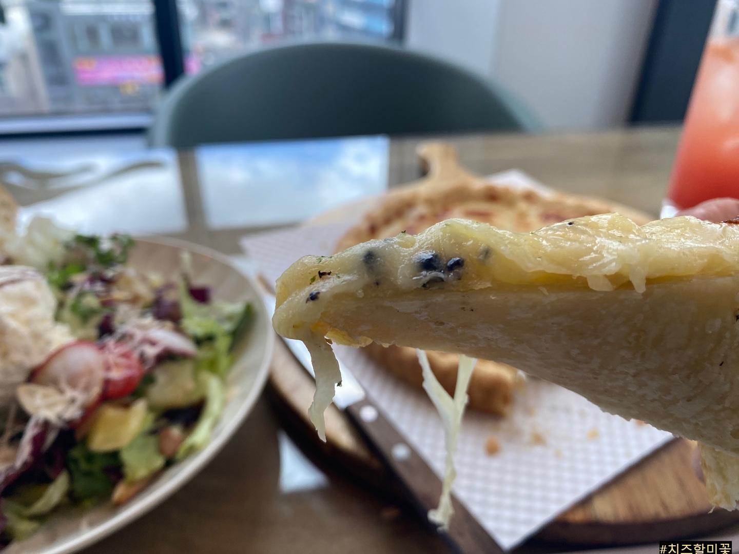 샐러드도 너무 맛있었고 피자도 맛잇습니다. 특히 피자 도우가 맛있었어요. 애플파이에 치즈가 올라간 피자였는데 도우가 아닌 파이라서 다 먹을 수 있었습니다. 보통 피자는 가운데만 먹는데 여기 피자는 다 먹었습니다. 정말 특이했습니다. 와서 한번 맛보셔요. 여러분은 어떨지 몰라도 저는 처음 먹어본 것이라서 너무 맛있게 잘 먹었습니다. 양도 꽤 많아서 좋았습니다. 신선한 야채를 맛볼 수 있는 샐러드도 너무 좋았습니다.