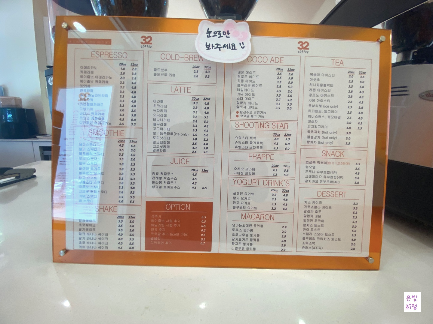 정말 많은 음료도 있고 여기만의 음료도 있다. 그리고 떡볶이와 디저트도 있다. 떡볶이는 굶은 남작가락국수면발처럼 생겼다. 그리고 맛있다. 커피 외에 여러 음료가가 많아서 너무 좋다 왜냐면 내가 커피알레르기가 있어서 다른 음료와 예를 들어 에이드나 스무디랑 같이 떡볶이를 먹을 수 있다. 내부는 주황색으로 깔끔하게 되어 있다. 사장님이 친절하다. 32커피자세히보기