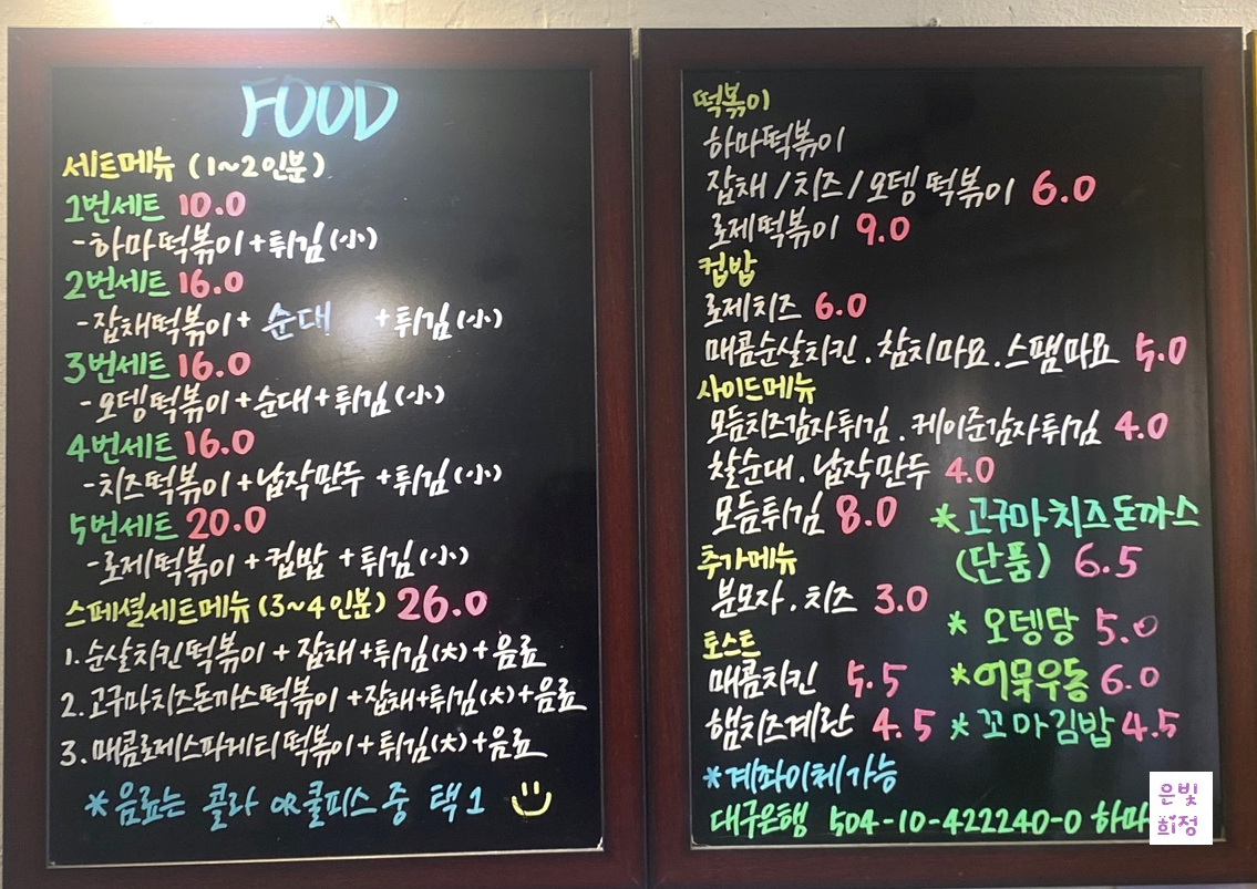신월성에 있는 분식맛집이다. 여기는 커피가 아메리카노만 먹을 수 있다. 그외 모든 분식을 먹을수 있다 김밥부터 면종류와 떡볶이가 잇다. 덕볶이의 맵기 조절이 가능한 곳이다. 분식집이라 가성비는 좋은 편입니다. 김밥이 맛있으니 김밥이랑 같이 먹는 걸 추천하고 혹 덥다면 냉면세트를 추천한다. 냉면에 납작 만두 4개가 나오는데 적당하게 양이 맞다. 떡볶이의 맛은 추억의 맛이다. 학교 앞에 팔던 그 맛이다.