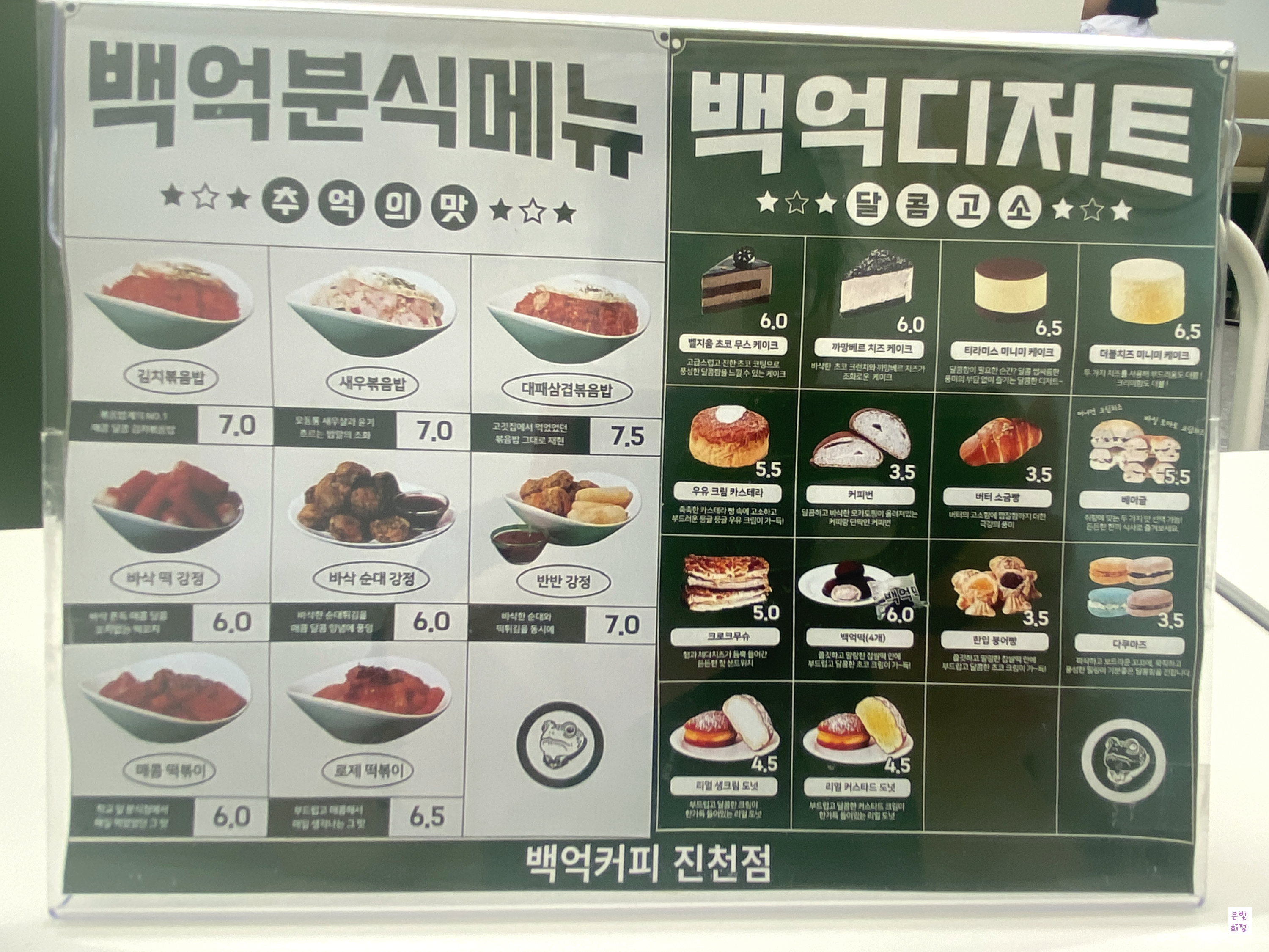 백억 커피는 원배이마트맞은편에 있습니다. 커피 외 여러 음료 디저트가 있다, 야식간식도 있고 내가 좋아하는 떡볶이도 있고 분식류도 있다 볶음밥도 있고 괜찮다. 내 입맛엔 떡강정이 맛있다. 반반강정은 순대랑 떡이 반반으로 나오는 찍먹으로 나오고 떡강정은 부먹으로 나온다 떡볶이는 매콤떡볶이라고 되어 있지만 하나도 안 맵고 떡이 작다. 아이들이 먹을 수 있는 크기이다. 여기 떡볶이는 떡모양부터 해서 별로다. 양은 일반 분식집의 양으로 비교하면 안 된다 일분 분식집의 2배 정도 되는 가격이다. 그런데 다른 카페도 그렇다.
