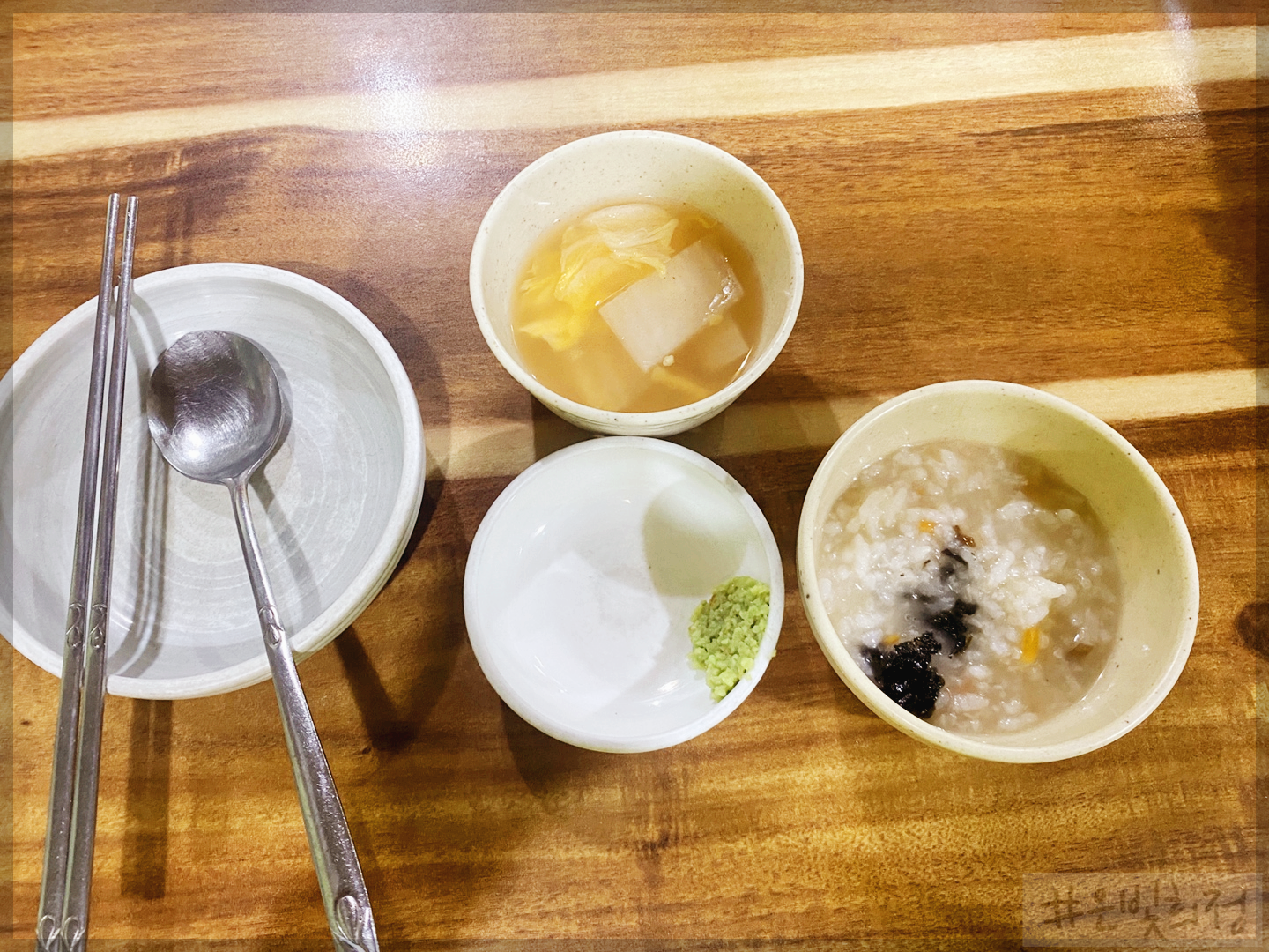 처음에 오면 테이블에 앉으면 죽과 기본반찬들이 나왔습니다. 주고 아주 맛있었어요. 식전 죽이라 더 맛있었던거 같아요. 반찬도 다 맛있었어요. 저희는 세트 요리를 주문했고요. 2인세트로 불고기탕 껍질무침이 나오는 순서로 먹었어요. 음식이 나오는 순서는 껍질을 무침- 불고기-탕 순서로 나왔는데요. 탕은 맑은 물을 선택할 수도 있고 매운 얼큰한 국물을 선택할 수 있썼어요. 저희는 맑은탕을 선택했습니다.